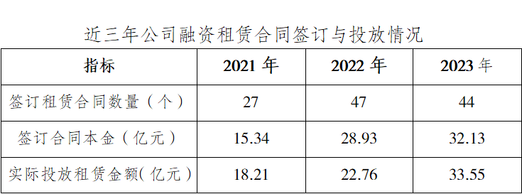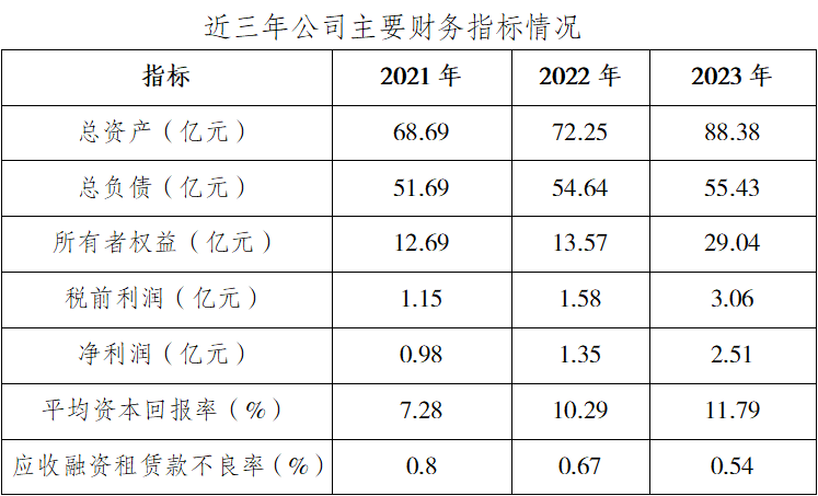 公司成立以来连年盈利,2023年公司增资后,经营业绩实现大幅提升,当年实现利润总额超3亿元,净利润2.51亿元,同比增长85.93%。公司累计向股东分配现金股利10.68亿元,上缴税收4.68亿元。公司成立至今已累计向240余名客户提供融资租赁资金300亿元,实施项目近270个。